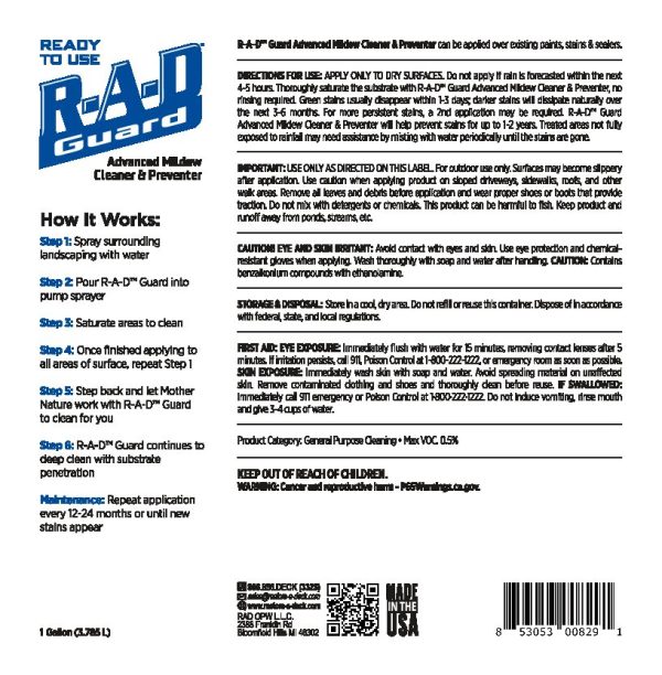 R-A-D™ Guard RTU (Ready-To-Use formula) is a no-rinse cleaner and preventative that is safe and effective for removing and preventing stains caused by mold, mildew, and algae on exterior surfaces and exterior wood or deck stain coatings. R-A-D™ Guard cleans without pressure washing, scrubbing, or rinsing. Contains no bleach, chlorine, acid, sodium hydroxide, or phosphates.