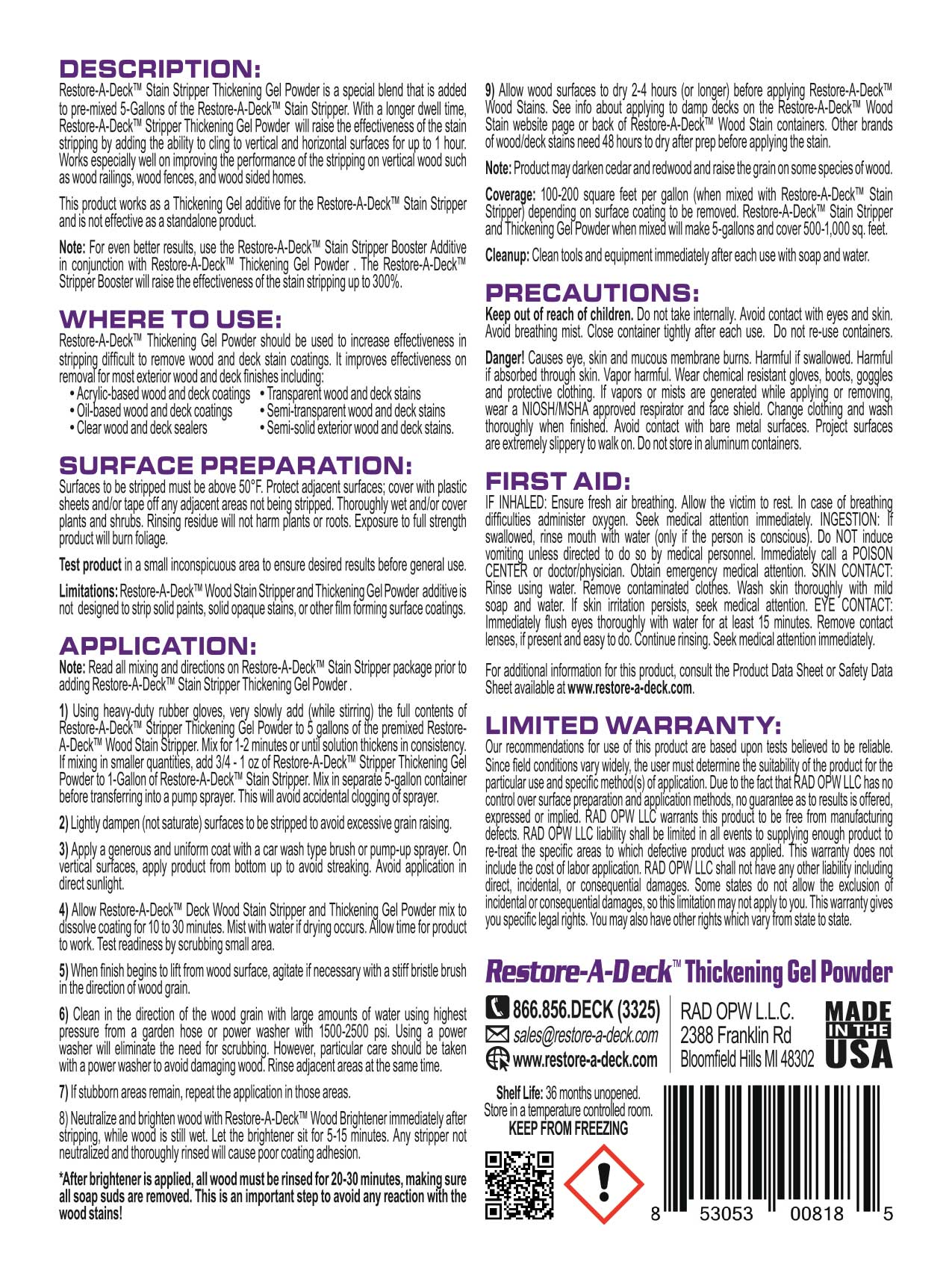 Restore-A-Deck Stain Stripper Thickening Gel is a special powder blend that is added to premixed 5-Gallons of the Restore-A-Deck Stain Stripper. With a longer dwell time, Restore-A-Deck Stripper Thickening Gel will raise the effectiveness of the stain stripping by adding the ability to cling to vertical and horizontal surfaces for up to 1 hour. Works especially well on improving the performance of the stripping on vertical wood such as wood railings, wood fences, and wood sided homes.