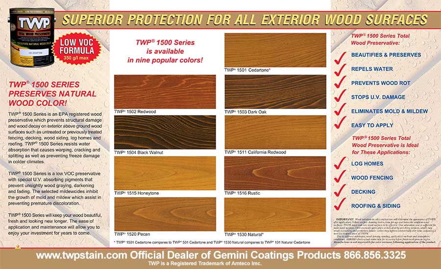 TWP® 1500 Series is a low VOC preservative with special U.V. absorbing pigments that prevent unsightly wood graying, darkening and fading. The selected mildewcides inhibit the growth of mold and mildew which assist in preventing premature discoloration.